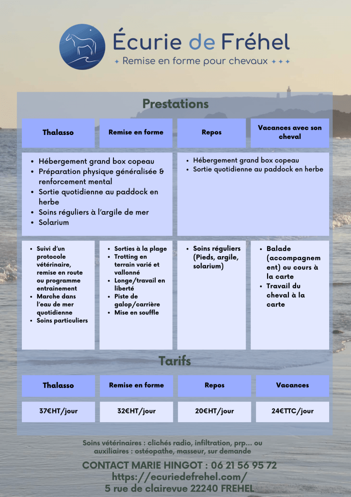 Le site de l’Écurie de Fréhel est en création, retrouver ci dessous nos prestations et tarifs. A bientôt !