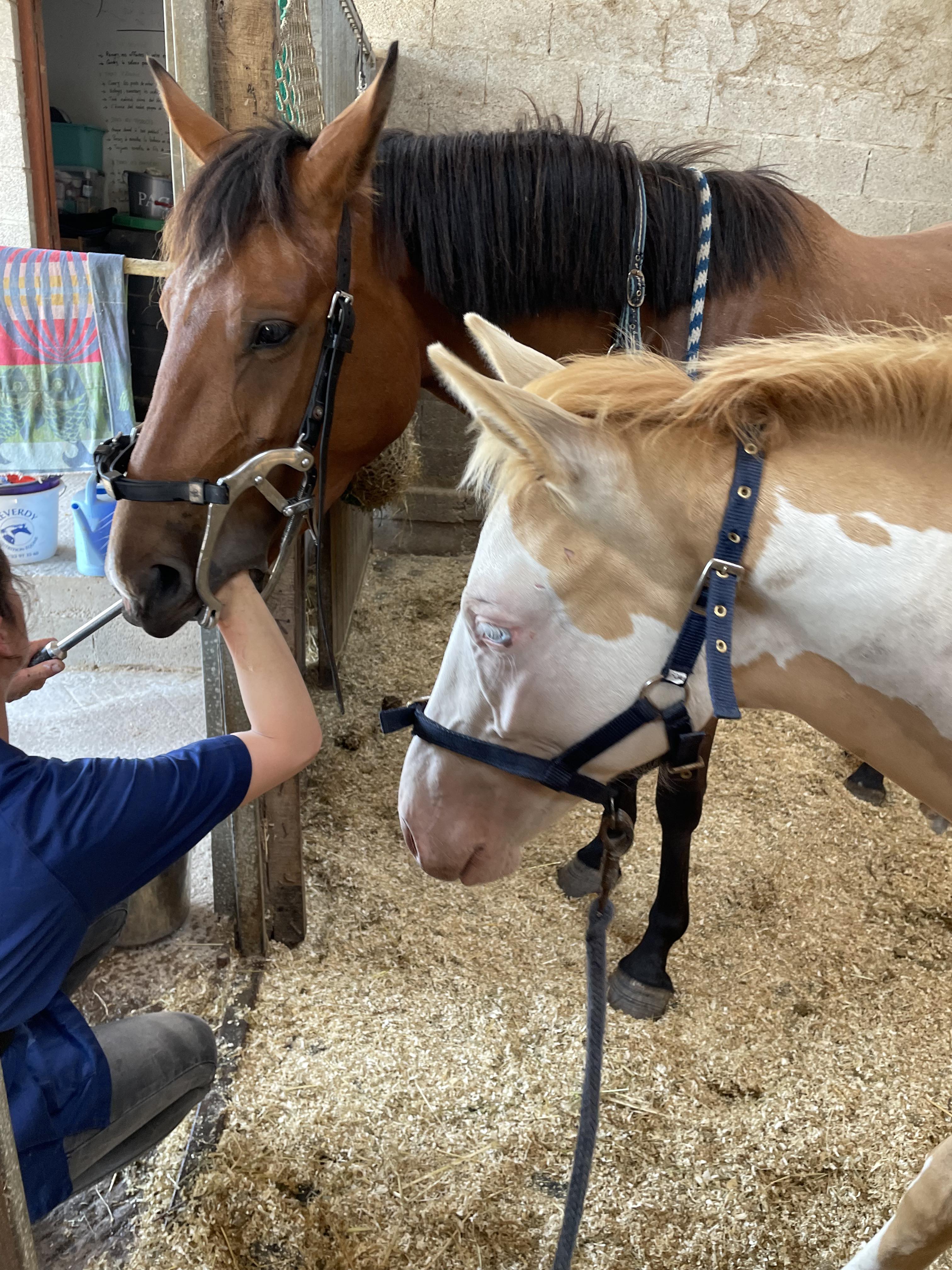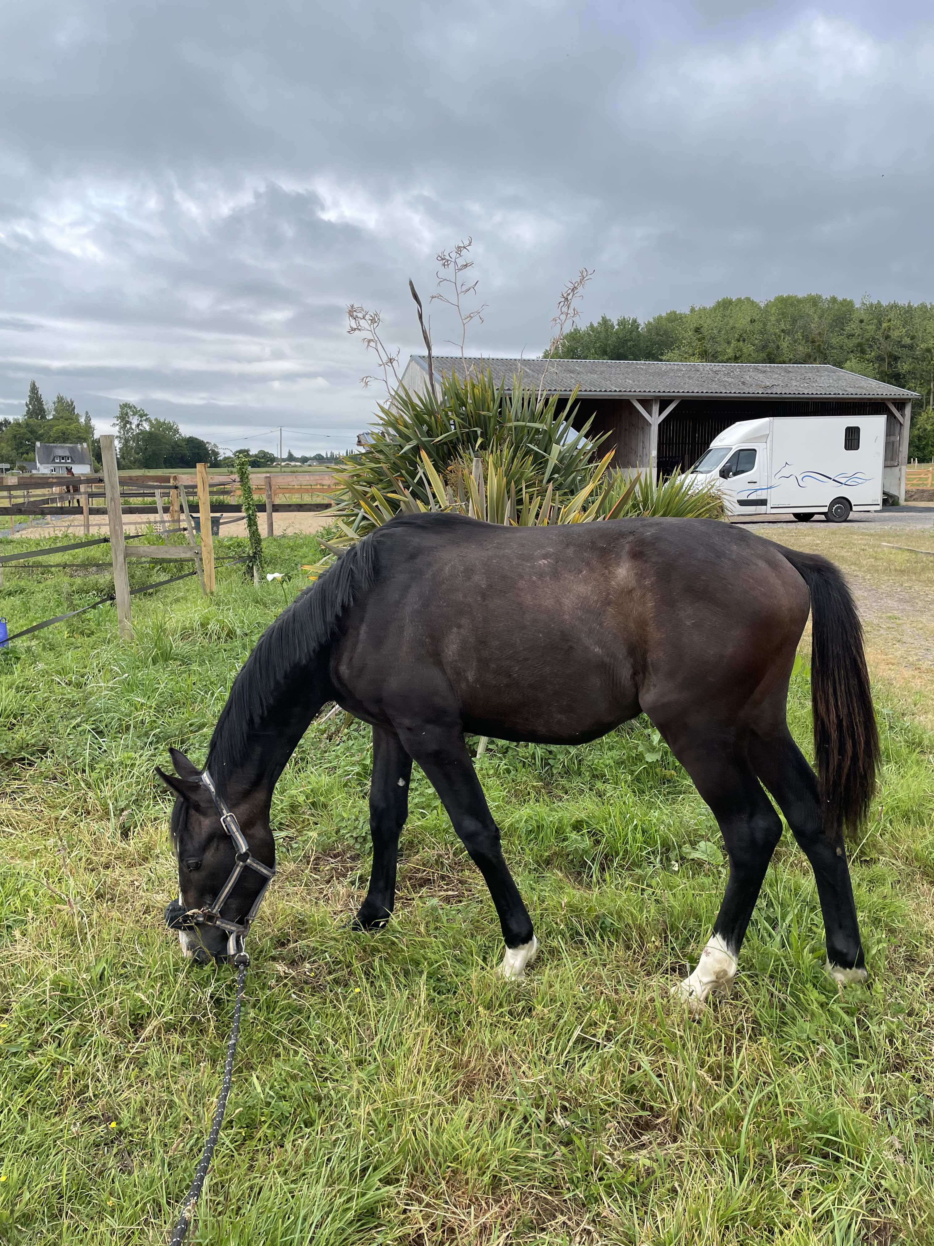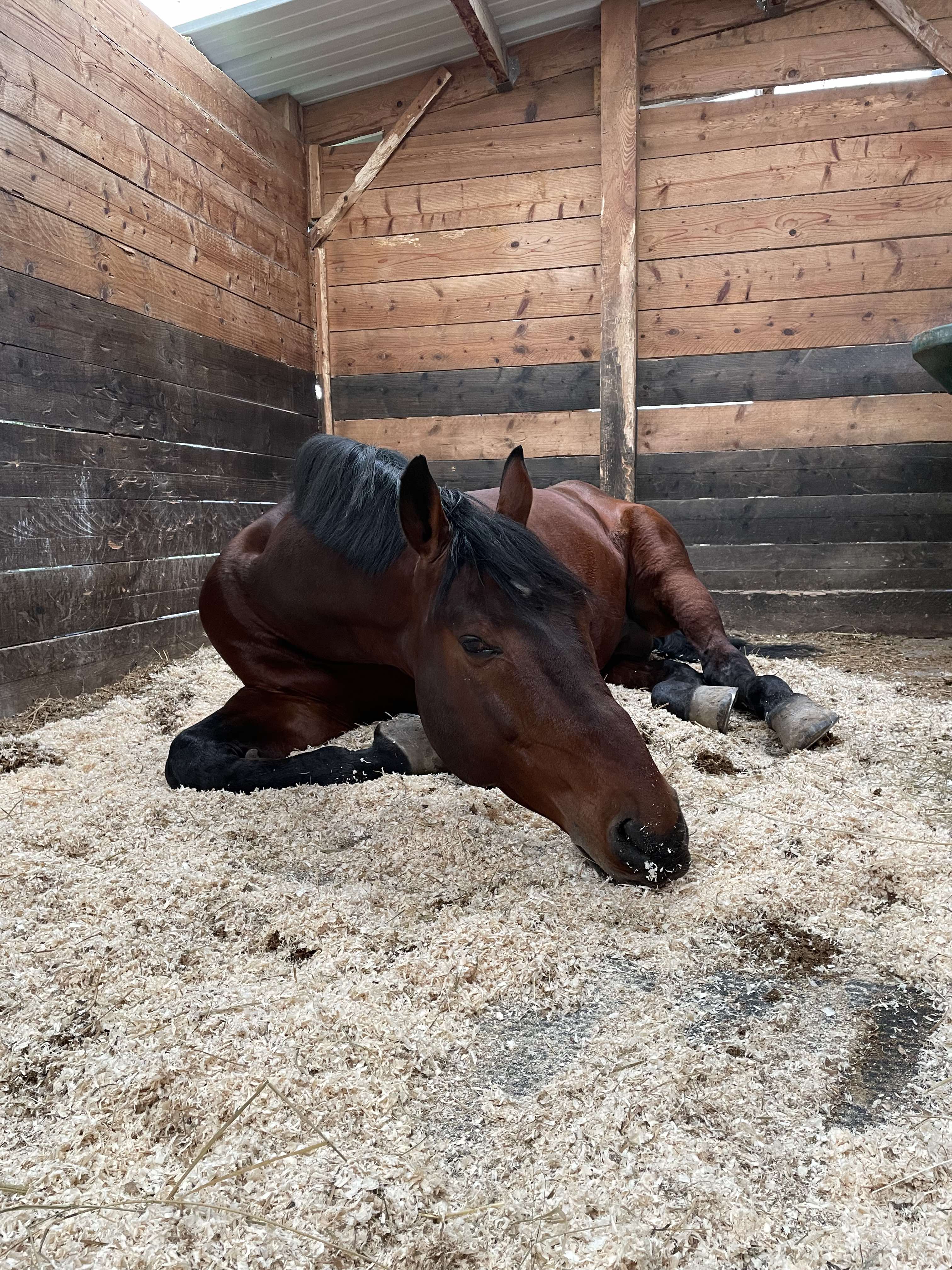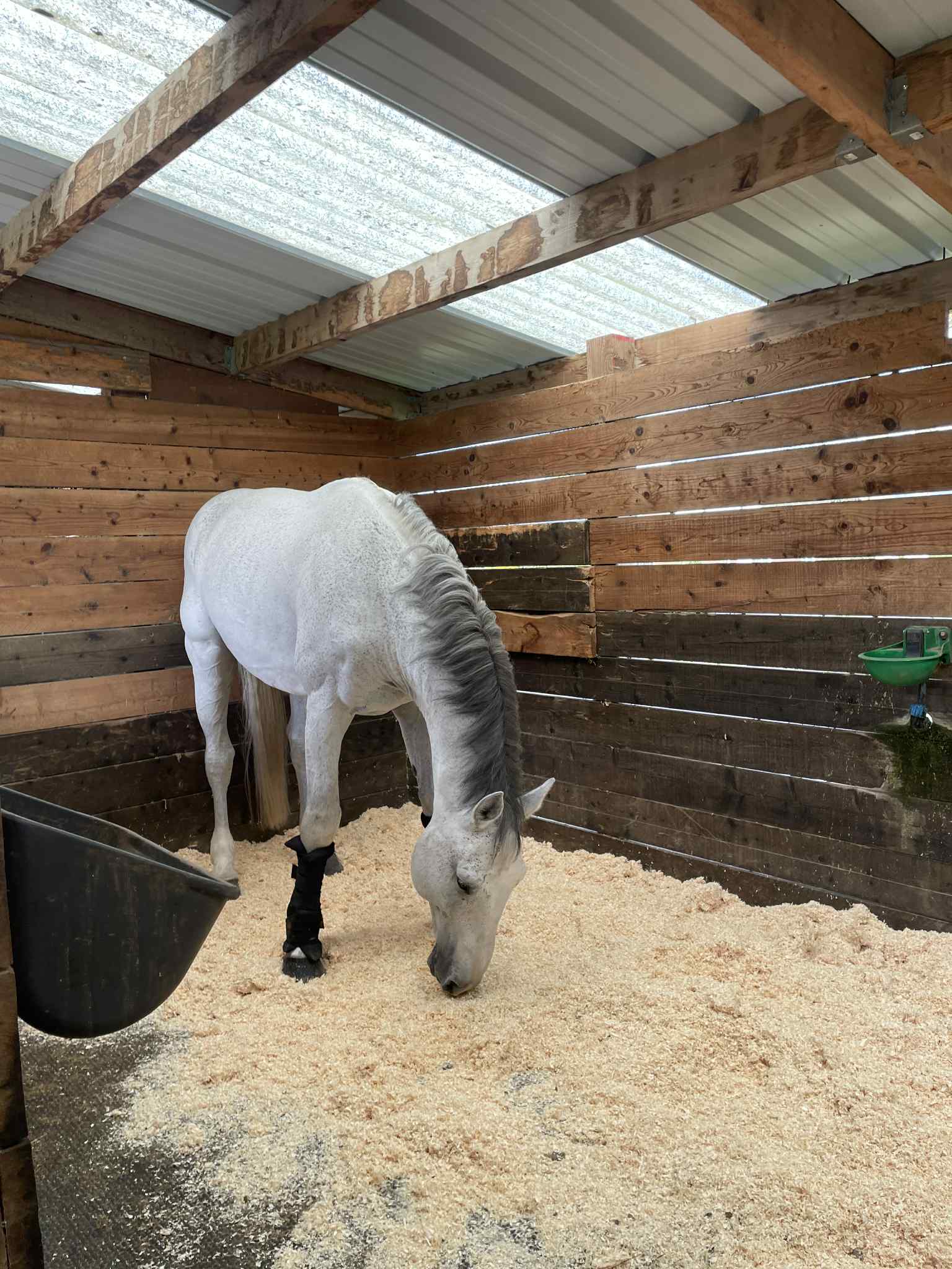 Hébergement boxes 6×3 sur copeaux // Foin à volonté en filet slow feed // Sorties quotidiennes paddock en herbe ou en sable (selon les besoins, sauf contre-indication vétérinaire)